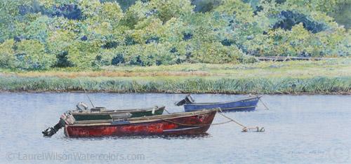 Description: The boats of shell fishermen bob at anchor on the Mitchell River in Chatham at noon on a bright, sunny day.