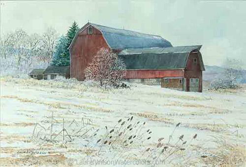 Description: A gambrel-roofed barn in Henrietta, New York is depicted in winter. In the foreground field are the teasel plants common to western New York.