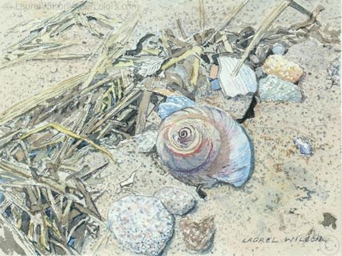 Description: A moonsnail nestles between pebbles, seaweed and cordgrass debris on a sandy beach in Barnstable Harbor.