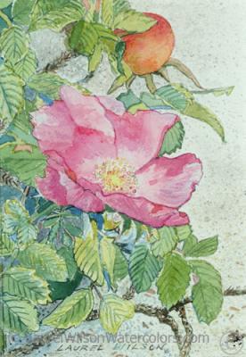 Description: A single pink salt spray rose (Rosa Rugosa) and its seedpod rose hip is depicted against a sand background. The salt spray rose is a common, non-native wildflower on barrier beaches of Cape Cod.