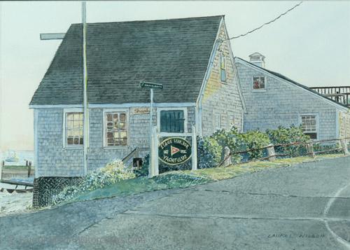 Description: The Stage Harbor Yacht Club owns the small, shingled building at the entrance to the old pier area at Stage Harbor. Next to the door of the building is a hand printed sign that says "Shanty", humorously describing the type of building many a tourist and photographer might be in search of.