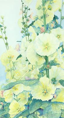Description: The stalks of lemon yellow hollyhocks stand out against a clear summer sky and are an excuse to experiment by using a bright color and vertical format not normally employed in my watercolors.