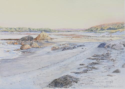 Description: Crowe's Pasture, in East Dennis, where woodland and dunes meet the water of Cape Cod Bay, has a sandy shore with glacial erratics (rocks). It is shown as it appears in the late day sun.