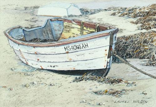 Description: A skiff, showing the ravages of water and time, is anchored on the beach after a storm in Chatham, Massachusetts.